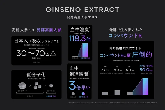 様々な健康に関連する効果が報告されている高麗人参の有用成分「ジンセノサイド」は、そのままでは分子が大きく、腸内細菌の環境を含む体質によっては吸収されにくいという課題がありました。KINS PRIMEは、独自の菌による発酵技術を用いることで、有用成分を吸収しやすい低分子の「コンパウンドK(Compound K )」へ変換。腸内環境の状態に左右されずに、その力を届けやすくすることを目指しました。