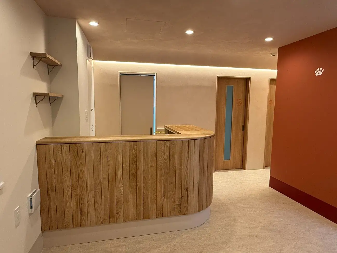 これまで当院では開放感を重視し、あえて診察スペースを区切らない設計としてまいりました。しかし、来院される患者様の多様化に伴い、愛犬・愛猫がより落ち着いて診察を受けられる環境づくりの重要性が高まっていると考えております。そこで今回のリニューアルでは、診察室を独立した部屋として区切る「個室化」を導入し、より安心してお過ごしいただける診療環境を整備いたしました。